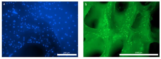 ASCs on the osteoplastic matrix, 72 h cultivation: (a) cell nuclei stained with fluorochrome: Hoechst 3334, BD Pharmingen™; (b) viable ASCs, cytoplasm stained with Calcein AM fluorochrome (BD Pharmingen™).