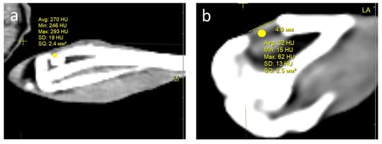 Condition of the defect area and computed tomography (CT) examination. One month after the operation, all rabbits in both groups showed signs of regeneration of the inflicted experimental bone defect in the form of a decrease in its size by 1–2 mm. The size of the defect, determined by CT measurements on the day of surgery, corresponded to the intraoperative measurements. At the CT densitometry assessment of the area after 1 month, the Hounsfield index among all rabbits in the control group (grafted osteoplastic matrix) was 69–271 HU. The average values of the X-ray density of the entire volume of the graft in the animals in this group were 142–229 HU, which indicated the heterogeneous nature of the cavity contents (Figure 8a). The values of this parameter in the experimental group (hybrid polymer) ranged from 15–89 HU. The average values of the X-ray density of the entire volume of the graft in the animals in this group were 31–67 HU (Figure 8b). This very insignificant scattering of values indicated the homogeneity of the graft. In the cortical bone structures adjacent to the defect, the Hounsfield index value was 680–720 HU.
