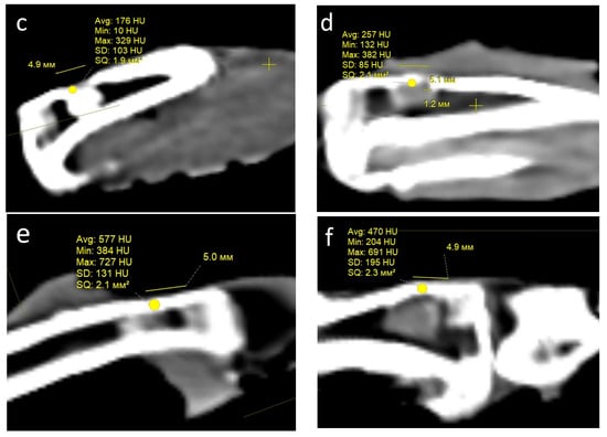 CT scan—section through the center of the implant in the sagittal direction, observed: at 1 month: (a) control, (b) experiment; at 2 months: (c) control, (d) experiment; at 6 months: (e) control; (f) experiment.