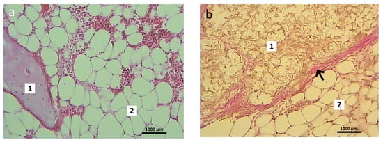 Graft localization area in animals 1 month after surgery: (a) control group (1—fragment of the control material–osteoplastic matrix, 2—bone marrow). Hematoxylin and eosin staining; 200×); (b) experimental group (1—elements of experimental material–hybrid polymer; 2—bone marrow; connective tissue fibers are indicated by arrows). Van Gieson staining; 200×.