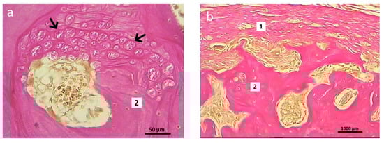 Perifocal area in the experimental group animals 1 month after surgery: (a) accumulation of chondrocyte-like cells (indicated by arrows) in close contact with elements of the bone tissue—2, Van Gieson staining: 400×; (b) erosion lacunae in the form of clefts are clearly visible in the contact area of the periosteum inner layer—1 and bone compact substance—2. Van Gieson staining; 200×.