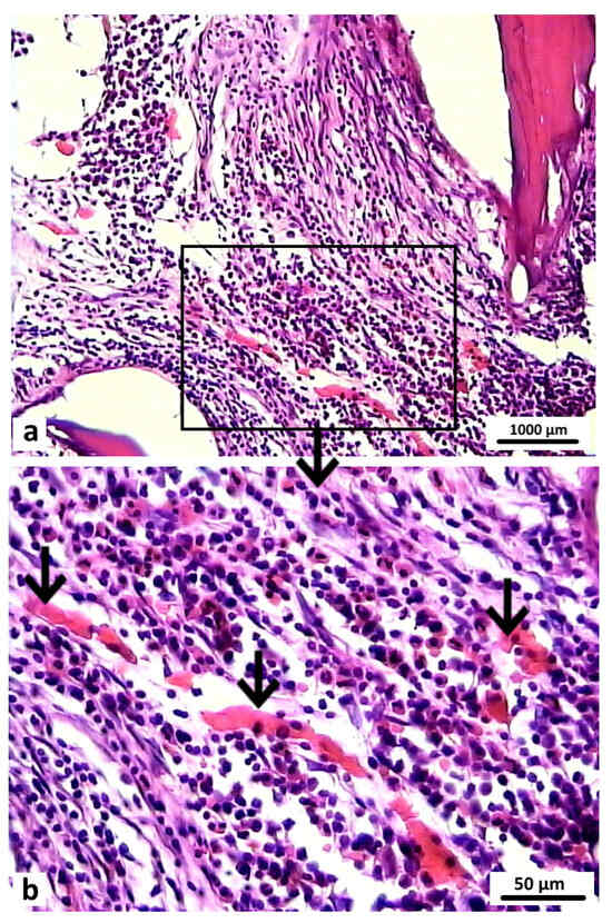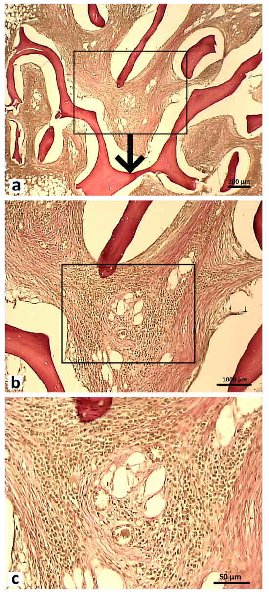 The perifocal area, as with that in the control group, contained areas filled with chondroid-type cells (Figure 11a). Erosion lacunae in the form of clefts were clearly visible in the area of contact between the compact bone substance and the inner layer of the periosteum. These lacunae occurred both in isolation and accumulated in large groups (Figure 11b). There were no signs of any inflammatory reaction in either the control animals or the experimental group animals.
