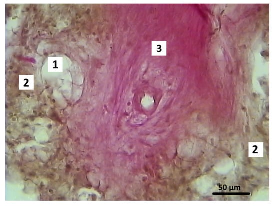 For morphological examination, the material was fixed in a 10% neutral buffer solution of formalin (Labiko, Saint Petersburg, Russia) for 2 days. The decalcification of the bone tissue was conducted in a Softidek EDTA-based decalcifying solution in an acid buffer. After the decalcifying solution, the material was washed with running water for 30–60 min. Then, it was histologically processed according to the standard scheme. After processing in ethanol, the material was placed into Gistomix Extra paraffin medium (OOO BioVitrum, Saint Petersburg, Russia).