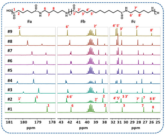 The 13C NMR spectra of PA56/512 with different composition ratios are shown in Figure 2. Region #a (181–178 ppm) represents the characteristic peak positions of the C (1, 1′) atom of diacids in PA56/512. All α-C of diamines (6, 6′) and diacids (2, 2′) in PA56/512 are displayed in region #b (43–37 ppm) and the β/γ-C of diamines (7, 7′, 8, 8′) and β/γ/δ-C of diacids (3, 3′, 4, 4′, 5, 5′) appear in region #c (32–25 ppm). Furthermore, the characteristic peak intensity of C atoms in diacids (1), α-C in diacids (2) and β-C in diamines (7) in 56 units of PA56/512 decreased gradually with an increase in 512 content. On the other hand, the peak intensity of the corresponding C atom position in the 512 unit (1′, 2′, 7′) of PA56/512 increased gradually, which is consistent with the feeding ratio, demonstrating the successful preparation of a PA56/512 random copolymer.