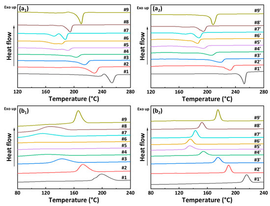Compared with Figure 3b1,b2, BOPA-56/512 shows an obvious exothermic crystal peak around the “eutectic” point along with a relatively narrow crystallization peak shape. Meanwhile, PA56/512 without biaxial stretching are vice versa. Otherwise, the crystallization peak position of BOPA-56/512 moves to the higher temperature position by more than 10 °C compared to PA56/512 without biaxial stretching. It can be concluded that the crystallization capacity of PA56/512 is obviously improved by bidirectional stretching.