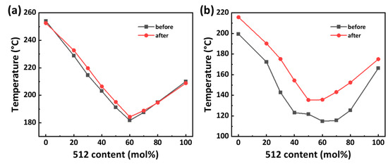 The melting and crystallization curves of PA56/512 before and after biaxial stretching with different composition ratios from the DSC tests are shown in Figure 3. It can be clearly seen from Figure 3a1,a2 that the melting points of both decrease first and then increase with an increase in 512 content, according to the typical isodimorphism behavior [30]. And the crystallization curves display a similar trend. Figure 4 depicts the melting and crystallization temperature curves of PA56/512 before and after biaxial stretching with different contents of 512. The lowest melting point with a 512 content of 60 mol% is regarded as a “eutectic” point of the isodimorphism system [31], which is considered to be the dividing point of the dominant crystal form of the 56 or 512 homopolymers. Furthermore, it can be observed that the melting point of PA56/512 hardly changes before and after biaxial stretching, which means that the biaxial stretching behavior will not alter the isodimorphism properties of the copolymerization system of PA56/512.