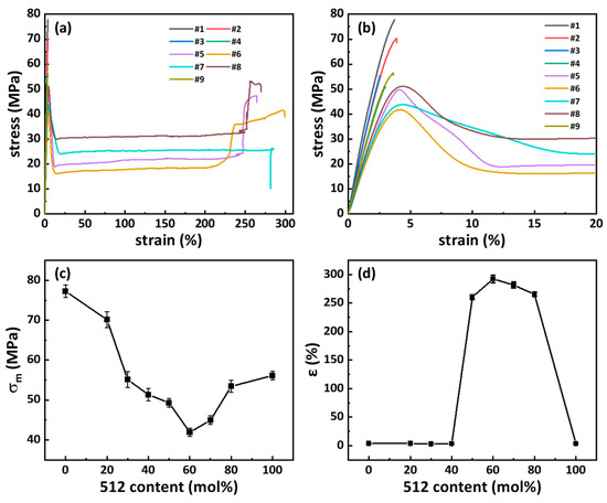 The mechanical properties curve of PA56/512 resin: (a) tensile stress–strain curve, (b) local enlarged tensile stress–strain curve, (c) tensile strength with different contents of 512, (d) tensile elongation yield with different contents of 512.