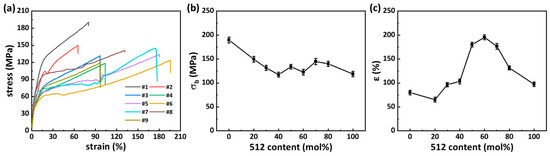 The tensile properties of BOPA-56/512 films: (a) tensile stress–strain curve, (b) breaking strength with different contents of 512, (c) tensile elongation yield with different contents of 512.