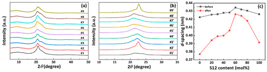 The XRD pattern of PA56/512 before and after biaxial stretching is shown in Figure 9a,b for crystal analysis of the system. All the samples presented a single peak at a similar diffraction angle (2θ) of 20.5°~22.5°, corresponding to the (010) planes of PA56/512, whose crystal pattern belongs to the typical pseudohexagonal γ form [39,40]. The corresponding value of d-spacing d010 representing the distance between the hydrogen bond planes was derived by the Bragg equation, and the d-spacing curves of PA56/512 before and after biaxial stretching with different contents of 512 are drawn in Figure 9c. It can be observed that the d010 increased first and then decreased with an increase in the 512 content, reaching a maximum value at the “eutectic” point with a 512 content of 60 mol%. According to the crystallography principle, the crystallization of polymers follows the densest packing principle [41,42]. The higher the crystal order degree, the higher the crystal packing density and the shorter the hydrogen bond plane spacing [43]. The high molecular symmetry of PA56 and PA512 homopolymers results in a highly ordered crystalline structure of themselves, and thus, the #1 and #9 samples have relatively low hydrogen bond plane spacing. In other words, the order degree of the crystals formed by random copolymerization of PA56 and PA512 corresponding to the #2~#8 samples was lower than that of their own original homopolymer. When 56 was dominant in the copolymer system, the insertion of 512 resulted in a lower orderliness than the original PA56 system. Similarly, when 512 crystals dominated, the insertion of 56 caused the copolymer system to be less ordered than the original PA512 system. Therefore, it can be explained that the hydrogen bond plane spacing of PA56/512 increased first and then decreased with an increase in 512 contents, and the whole system reached the maximum hydrogen bond plane spacing and the lowest crystal orderliness at the “eutectic” point with a 512 content of 60 mol%.