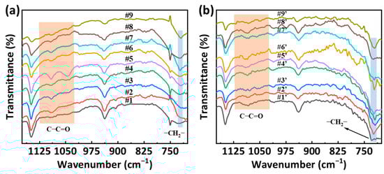 FTIR spectra in the fingerprint region of PA56/512 (a) before and (b) after biaxial stretching with different composition ratios.