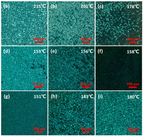 POM images of PA56/512 after biaxial stretching: (a) #1′, (b) #2′, (c) #3′, (d) #4′, (e) #5′, (f) #6′, (g) #7′, (h) #8′, (i) #9′.