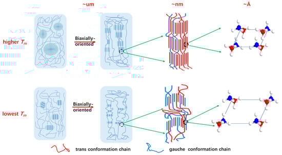 In addition, not only does the crystallization structure have a significant impact on the copolymer properties, but the processing method also plays a crucial role in the enhancement of copolymer properties. Casting stretching, blown film process and biaxially-oriented stretching methods are the common process solutions for film production. Particular focus has been on the biaxially-oriented film in recent years because of the advantages of fast production speed, large production capacity and high efficiency [23,24]. The crystalline ordering and crystallinity of the film obtained by bi-directional tensile orientation will also be significantly improved owing to the highly oriented orientation of the molecular chain, along with the improvement in tensile properties, barrier properties, dimensional stability, thickness uniformity and other properties of plastic film [25,26]. Biaxially-oriented polyamide (BOPA) [27], polypropylene (BOPP) [28] and polyester (BOPET) [29] have been used for flexible packaging applications and also new advanced applications such as the lithium battery.