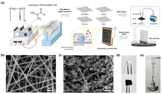 Polyacrylonitrile (PAN, average MW = 150,000) and N,N-Dimethylformamide (DMF, ≥99.9%) were purchased from Sigma-Aldrich Co., Ltd., St. Louis, MO, USA. Nanocarbon black powder (NCB), used to increase the specific surface area of the PAN nanofiber mat, was obtained from Mitsubishi Chemical Co., Ltd., Tokyo, Japan. To uniformly disperse the NCB in deionized (DI) water, cetyl trimethyl ammonium bromide (CTAB), obtained from Tokyo Chemical Industry Co., Ltd., Tokyo, Japan, was used. Different substrates, including fiberglass, copper, stainless mesh, and fabric screen, used to support the thin PAN nanofiber mat with a thickness of several hundred micrometers, were purchased as commercial products. To fill the nanochannels with the ion solution for electricity generation, calcium chloride (CaCl2, ≥97.0%) powders were obtained from Sigma-Aldrich Co., Ltd. An adhesive copper foil tape for electrode connection of the generators was obtained from Teraoka Seisakusho Co., Ltd., Tokyo, Japan.