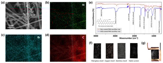 Characterization of PEEGs. (a) SEM image of NCB-coated PAN nanofibers and its EDS maps of (b) N (green), (c) Br (teal), and (d) C (red) elements; (e) FT-IR spectroscopy to prove the property modification of the PAN nanofiber mat; (f) back sides of NCB-coated PAN nanofiber mats with different support substrates; (g) PEEGs with copper electrodes connected with single-end electrical alligator clips.