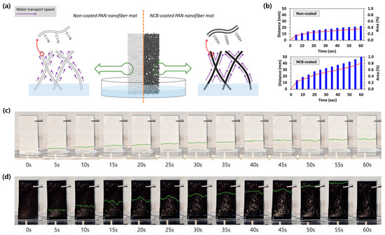 Comparison of the water transfer abilities between the raw PAN nanofiber mat and the PEEG with the fabric substrate. (a) Schematic illustration of water transports in non-coated and NCB-coated PAN nanofiber mats; (b) distance and wetted area changes of raw and NCB-coated PAN nanofiber mats transporting water in vertical direction; distance changes of (c) non-coated PAN nanofiber mat and (d) NCB-coated PAN nanofiber mat transporting liquid water in vertical direction.