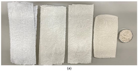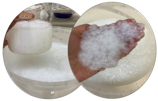 OHC was prepared for nitration by rubbing through a 1 mm mesh sieve. The BC gel-film was ground in a Midea MC-BL801 blender (Beijiao, China) individually (Figure 1) or with OHC added in the above-mentioned proportions until a homogeneous mass was obtained. Afterwards, the mass was poured out into silicone molds and subjected to freeze-drying in an HR7000-M freeze-drier (Harvest Right LLC, North Salt Lake, UT, USA). Figure 1 displays the appearance of the homogenized BC. The freeze-dried cellulose samples were comminuted in a LU-2605 electric mill (LUMME, Ningbo, China) to fine flakes of 1–3 mm in size. The moisture of the samples prepared for nitration was at most 5%.
