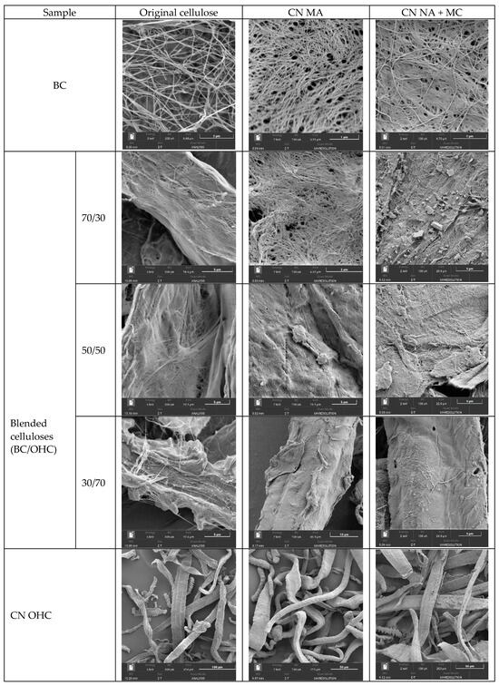 The SEM images were taken at different zoom levels (×500–50,000) to make the difference between the CN precursors and CNs themselves more visible. The different zoom levels were able to demonstrate the fiber uniting–merging effect in the cellulose blends and their CNs. The top and bottom lines in Figure 3 show a conceptual difference in the structure and dimension of the bacterial cellulose (BC) and oat-hull cellulose (OHC) fibers: the former exhibits a reticulate fiber structure with a nanoscale fiber width, specifically 40–70 nm, while the latter consists mainly of flat cellulose fibers distinct in shape and dimensions: ribbon-shaped, spiral-shaped, or curved fibers with toothed edges, a fairly even shape, and a fiber width of 10–40 µm. Once nitrated, CN BC became structurally more compact while retaining the reticulate structure of the starting BC, in agreement with other studies [31,33,36]. When nitrated, the plant cellulose also retained the fiber shape of the starting cellulose; however, the CN fibers swelled and their surface became smoother. The fibers of CN OHC MA were more bulky and smoother compared to those of CN OHC NA + MC.
