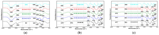 Following nitration (Figure 4b,c), the intensity of peaks corresponding to hydroxyl groups (3339–3354 cm−1, 2895–2898 cm−1) significantly decreased due to the partial substitution of hydroxyl hydrogen by the NO2 group in the CNs. As the degree of substitution increased, the nitrogen content of the CN samples (Table 2) also increased, while the intensity of hydroxyl peaks became less pronounced. This observation aligns with previous studies reported in [8,11,37,57,58]. Specifically, the CN NA + MC samples exhibited a lower hydroxyl intensity compared to the CN MA samples, consistent with their higher nitrogen content. On the other hand, the CN BC samples, regardless of the nitration method used, displayed the highest nitrogen content among the CN samples, resulting in the lowest peak intensity of the hydroxyl groups.