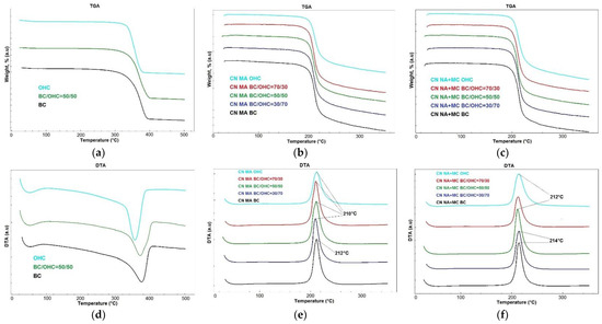 TGA and DTA images: (a,d) three cellulose samples (BC, BC/OHC = 50/50, OHC) and CN samples (CN BC, CN BC/OHC = 70/30, CN BC/OHC = 50/50, CN BC/OHC = 30/70, and CN OHC); (b,e) CN MA; and (c,f) CN NA + MC.