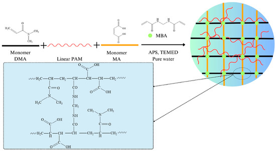 Semi-IPN hydrogel (SH) was synthesized by the free radical polymerization between DMA and MA in the presence of linear PAM solution; MBA was the cross-linker, TEMED was the accelerator, and APS was the initiator. The scheme of the synthesis is illustrated in Figure 1. First, 9 mL of 1% PAM solution, 9 mL DMA monomer, 1.3920 g MA, 0.12 g MBA, 7.2 mL solution of APS (0.084 mol/L), and 9 mL water were homogenized in a flask for 30 min by sonication. Then, the mixture was vacuumed for 30 min under ice-water conditions. Then, 7.2 mL solution of TEMED (1.068 mol/L) was dropped into the solution and stirred continuously for about 2 min. The mixture was rapidly poured into a mold to obtain cylindrical hydrogels with dimensions of 12 mm × 5 mm. After solidification, the hydrogels were sealed and stabilized for 24 h at 3–5 °C. Then, the hydrogel was purified with water continuously for 7 days at room temperature to remove unreacted reagents. Finally, the hydrogels were freeze-dried at −45 °C to obtain dried samples for further investigation [8,11].