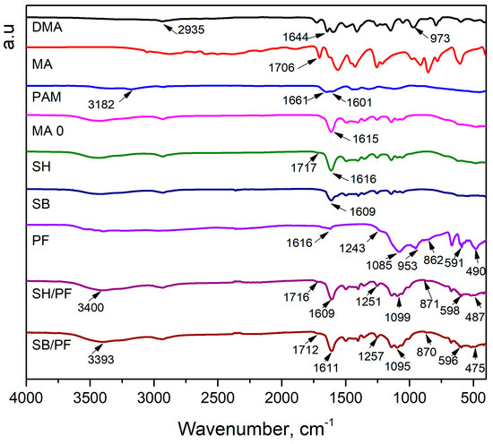 The FTIR spectra of monomer, linear polymer, hydrogels, PF, SH/PF, and SB/PF are presented in Figure 2. The DMA spectrum exhibited vibrations of C–H peak, C=O stretching peak, CH=CH2 peak, and C–N vibration at 2935, 1644, 973, and a range of 1050–1147 cm−1, respectively [42]. The characteristic functional groups of MA revealed at 1706, 1628, and 2381–3328 cm−1 are attributed to the C=O peak (carboxyl), C=C peak, and –OH vibrations spanning peak in order [43]. In the PAM spectrum, the three characteristic peaks of the amide group are shown at 1601 cm−1 (–NH2 bending vibration), 1661 cm−1 (–C=O stretching vibration), and 1415 cm−1 (–C≡N stretching vibration) [44]. The disappearance of the 973 cm−1 peak in the SH spectrum showed that polymerization occurred, and the shift of the C=O stretching peak (carbonyl) from 1644 to 1616 cm−1 indicated the successful incorporation of PAM into DMA and MA networks. The copolymerization of DMA and MA was demonstrated by the appearance of a 1725 cm−1 peak, which was attributed to the stretching vibration of C=O (carboxyl) [26]. Meanwhile, the vibration of this functional group was not observed on the SB spectrum, this is because, during the modification with KOH, the carboxyl groups were neutralized and converted into carboxylate groups.