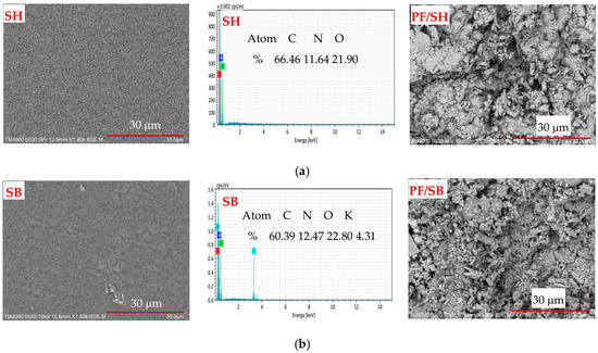 The surface morphology and EDX spectra of the hydrogels and PF-loaded hydrogels are presented in Figure 3a,b. The results showed that SH has a uniform and smooth surface, while SB begins to have rough spots. This difference may be due to the appearance of –COOK groups on the surface of hydrogel after the modification. This observation was emphasized through the EDX spectra of hydrogels. These results confirmed the successful modification of SH in the KOH solution. In addition, when observing the images of PF/SH and PF/SB, the images showed a significant change in surface morphology compared to SH and SB, respectively. This phenomenon is due to the existence of phosphate fertilizer adsorbed on the surface of the hydrogels, as demonstrated in the EDX mapping images of P element in Figure S1.
