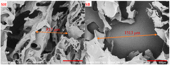 SEM images of SH and SB in Figure 4 showed a uniform porous structure with the largest pore size and estimated porosity increased significantly after modification, with values of about 817 to 1513 µm and 49.95 to 61.09%, respectively. This result can be explained by the attack of hydroxyl ions on the longitudinal substituents on the polymer chains, cleaving the C–N bonds, forming –COO– groups, and CH3–NH–CH3 molecules, as shown in Figure S2. Likely charged –COO– groups could create repulsive forces and increase the distance between polymer chains. In addition, the appearance of hydrophilic groups –COO– and the disappearance of hydrophobic methyl groups from the polymer increased the hydrophilicity of the hydrogel after modification, which led to the absorption of a greater amount of water and created larger pore sizes. The hydrolysis mechanism of amide groups in KOH can be described as follows. First, the nucleophile OH− attacked the carbon atom of the C=O group and formed a tetrahedral intermediate. Then, the proton continued to attack the position of the –N(CH3)2 group and broke the C–N bond. Finally, the hydrolysis formed polycarboxylates and dimethylamine molecules [46].