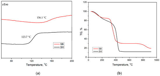 (a) DSC curves and (b) TGA curves of SH and SB hydrogels.
