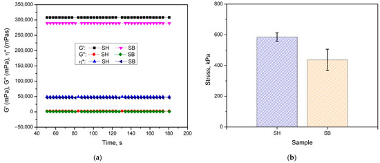 The data of rheological and mechanical measurements are illustrated in Figure 6a,b, and summarized in Table 2. The viscoelastic behavior of the hydrogels was confirmed as the storage modulus (G′) values did not depend on time and were much higher than the loss modulus (G″) values [28]. In addition, the values of G′, G″, viscosity (η*), and compressive stress of SB were lower than those of SH, indicating a significant effect of the modification in the KOH solution. These results could be due to the hydrolysis of amide bonds, which created large pores and reduced the uniformity of hydrogel, leading to easier sliding of the polymer chains and reduced stress dissipation. This phenomenon was also completely consistent with SEM images, as discussed above.
