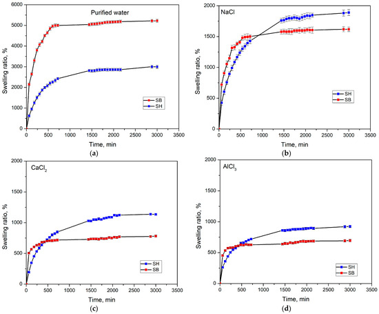 The hydrogels synthesized in this work are aimed at applications in cultivation. The swelling of the hydrogels when present in the soil will determine its ability to be reused. Therefore, this behavior of the hydrogels in 50 mM salt solutions with metal ions of different valence was investigated. In addition, the swelling behavior in water was also performed for comparison. The results are presented in Figure 7, and the relevant swelling kinetic parameters are listed in Table 3. Figure 7a shows that the swelling rate of the hydrogels in water increased rapidly in the early stage and reached equilibrium after 600 min, in which the swelling rate and equilibrium swelling ratio (SR) of SB were superior to SH. This significant effect of modification on swelling behavior in water could be explained by the fact that during the modification, some links in the PAM were broken and formed shorter chains, reducing the folded structure, and the polymer chains tended to straighten more. This increased the surface area since the hydrophilic regions tend to be more outward, leading to increased swelling. In addition, the increase in pore size and porosity after modification with KOH (as discussed in the SEM images) could also have a significant impact on the swelling behavior of SB in water compared to SH hydrogels.