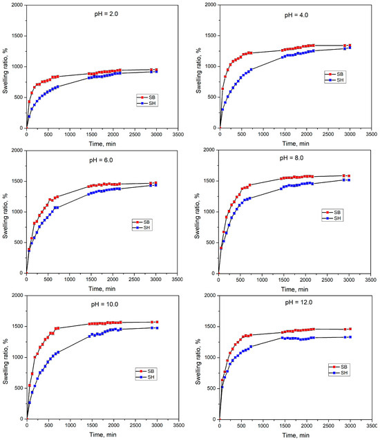 To evaluate the reusability of the hydrogels in acidified or alkaline soils, their swelling behavior in pH solutions was investigated. The swelling kinetic curves of hydrogels in pH2, pH4, pH6, pH8, pH10, and pH12 at 25 °C are shown in Figure 8, while the SR values are listed in Table 4. Under the same experimental conditions, SB had a higher swelling rate and a shorter time to reach equilibrium swelling than SH hydrogels. As is known, DMA-based hydrogels are not pH-sensitive due to the absence of ionizing groups [52]. However, the hydrogels in this work are pH sensitive after being copolymerized with MA [53]. At pH 2 (strong acid), the protonation of functional groups could be unfavorable leading to minimal water absorption. Then, SRs tended to increase as the pH values increased to pH 4, pH 6, and pH 8. This could be attributed to the ionization of functional groups, such as –N(CH3)2 to –NH(CH3)2]+ (for pH 4 and pH 6) causing cation-cation repulsion and –COOH to COO– (for pH 8) causing anion-anion repulsion. The repulsive forces between these ions expanded the structure of the hydrogels, enabling the absorption of larger amounts of water [54]. However, at pH > 8, the SRs reduced slightly due to the alkaline ions in the buffer solutions, reducing the electrostatic repulsion between the same charged –COO– groups. This phenomenon was also known as the “charge shielding effect” [50].