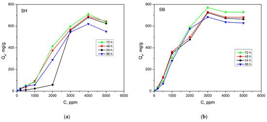 The maximum wavelength absorption of phosphate fertilizer (PF) is 880 nm [36]. A series of PF solutions with concentrations ranging from 2 to 20 ppm were prepared to develop the calibration curve with R2 = 0.9992. The amounts of loaded PF per mass of dried-hydrogel (Qe) of SH and SB at initial concentrations of 50–5000 ppm in 24, 48, 72, and 96 h at 25 °C are shown in Figure 9. When the initial PF concentration and contact time increased to a certain critical value, the Qe increased correspondingly. For SH, Qe reached a maximum of 710.8 mg/g at 4000 ppm after 72 h, while it was 770.9 mg/g at 3000 ppm after also 72 h for SB. This demonstrated a significant influence of hydrogel morphology on PF absorption. Due to the larger pore size and porosity, PF adsorption onto SB may have been more favorable, requiring a lower concentration gradient compared to SH. However, when the initial PF concentration exceeded the critical values, reverse osmosis caused Qe to decrease.
