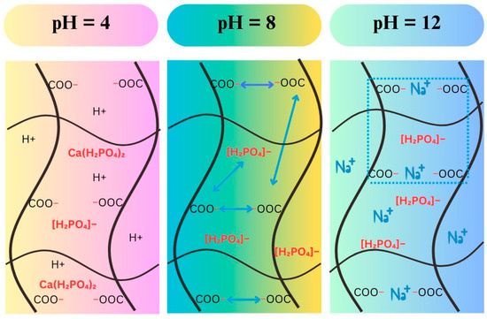 On the other side, the release speed was slow and did not change significantly in all three pH environments within the first 3000 min. And then, this speed increased significantly at pH 4 and pH 8, while this phenomenon was not observed at pH 12. This result may be due to at the initial stage, the dried hydrogels need time to become the swollen state. When the appropriate swelling state has not been reached, most of the PF will be retained inside the hydrogel. The PF release at pH 12 was the lowest due to the charge shielding effect, as discussed above. The existence of a high concentration of Na+ ions prevented the repulsion between –COO– ions, which could have significantly changed the morphology of the hydrogel. Additionally, these Na+ ions may have interacted with the H2PO4– molecules, leading to the PF being entrapped inside the material. At pH 8, the PF release was the highest. This result is because in this environment the charge shielding effect did not occur; the –COO– groups created a strong repulsive force for each other, causing structural expansion that facilitated the release of PF. Finally, in the acidic environment of pH 4, the dissociation of Ca(H2PO4)2 ⇌ Ca2+ + 2H2PO4– may have been limited, so the pF release speed and efficiency were lower than that at pH 8. The structures of PF/hydrogels at pH 4, pH 8, and pH 12 are illustrated in Figure 11.