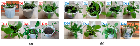 The applicability of hydrogels in agricultural technology was evaluated by observing the growth of mustard greens grown in soil containing PF/SH and PF/SB hydrogels. Figure 13 shows the growth of mustard greens in soil containing PF/SH observed for 25 days, and containing PF/SB observed for 32 days. The results showed that the leaves were wilted after 20 days when placed in soil containing PF/SH, while this phenomenon could be only observed after 32 days for soil containing PF/SB. To evaluate the impact of hydrogels on the growth process of mustard greens, the leaf length as a function of time was measured. Table 6 shows that the leaf length of mustard greens in PF/SB/Soil was a little longer than that in PF/SH/Soil. This difference was more obvious from day 7 to day 20. Finally, despite not adding water, the plants only stopped growing on day 20 for SH, and day 32 for SB hydrogel. These results may be because mustard greens are short-day plants with large foliage, so they need a lot of water and nutrients in a short time. SB hydrogel met these requirements as shown by the results discussed above regarding absorption and release of moisture and PF.
