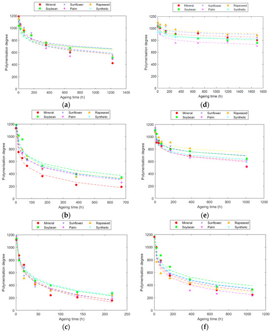 Evolution of the Kraft paper DP at: (a) 130 °C; (b) 150 °C; and (c) 170 °C. Evolution of TUK paper DP at: (d) 130 °C; (e) 150 °C; and (f) 170 °C.