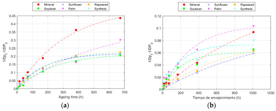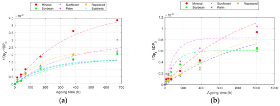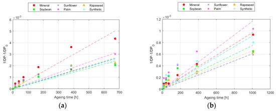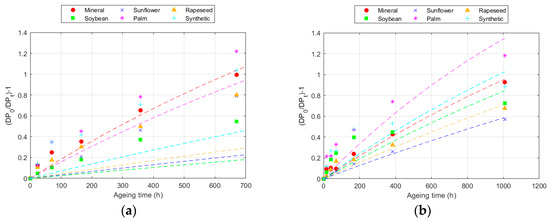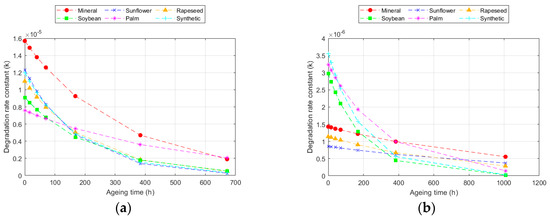 This model achieved better fits (R2) for all temperatures compared to the Ekenstam model, since it adapts to the variation in degradation rate. The values obtained varied, depending on the fluid and paper used. The value of k10 increased with the ageing rate. Thus, k10 was higher as the temperature increased and was also higher in the Kraft paper than in the TUK one [12,32]. Moreover, k10 was higher in the Kraft paper when aged with mineral oil and in the TUK paper when aged with the palm ester. However, in this case, it was necessary to analyse the degradation rate at each point. An example of this calculation is represented in Figure 4, which shows the degradation data for the two types of cellulose materials at 150 °C. The ageing rate changed over time, being higher in the early stages and slowing down later. This rate changed depending on the paper and fluid used; for the same exposure time at the same temperature, it was lower in the TUK paper. While the degradation rate decreased as the exposure time increased, the change was not the same in all the fluids. Some of them, such as the palm ester, showed a more constant ageing rate, while others, such as the sunflower ester, had a greater change [31,47].
