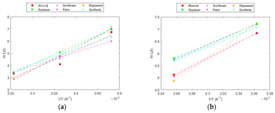 Moreover, from the value of the reaction constant and the Arrhenius equation, the activation energies required to initiate the reaction of the papers with each of the fluids were obtained. The higher the activation energy, the more energy is required to initiate a specific process [44]. Therefore, applied to the case of thermal ageing, a higher temperature is needed to start the degradation process. The results show that in the ageing process with Kraft paper, the energy required to initiate activation was lower with mineral oil, followed by palm and synthetic esters. The paper impregnated with the unmodified natural esters had the highest activation energies, as was indicated in the DP analysis.