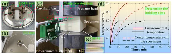 Experimental design, (a) DMA, (b) TG analysis, (c) Compression testing, (d) temperature-time curves of the environmental chamber and PMI specimen center, (e) SEM observation.