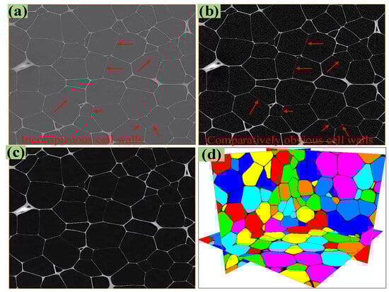 A 10 mm × 10 mm × 10 mm PMI foam specimen was used for Micro-CT tomography (YXLON-FF85CT, COMET, Hamburg, Germany), where the operating voltage, power, and spatial resolution used for the scanning were 90 kV, 250 W, and 3 μm, respectively. After scanning, a total of 3300 2D grayscale slices with a thickness of 1 pixel was obtained. In order to ensure a sufficient number of foam cells and also to improve the computational efficiency of subsequent rRVE, this work selected 1500 continuous 2D slices and intercepted 1500 pixels in both directions of each slice in-plane. Consequently, an rRVE model with actual dimensions of 4.482 mm × 4.482 mm × 4.482 mm was obtained. Due to the low Micro-CT value of PMI matrix material, the Micro-CT grayscale slices of local PMI foam are not obvious, as shown in Figure 2a. Thus, Avizo-2019 3D image processing software was used to adjust the contrast of the slices (in Figure 2a) to enhance the visibility of the thinner foam cavity walls, as given in Figure 2b, but which would increase the image noise. Therefore, the nonlocal mean filter in Avizo was applied to denoise the slices, and the resulting slices were given in Figure 2c. Finally, the threshold value of the foam cavity was set to 1, and the threshold value of the PMI matrix material was set to 0, thus establishing the PMI foam cell slice, as depicted in Figure 2d.