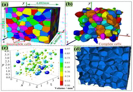 By assembling the 1500 continuous 2D slices, a 3D image of PMI foam was obtained, as given in Figure 3a, which shows that the foam cells on the boundaries are incomplete. Thus, all incomplete cells should be removed, as shown in Figure 3b. In addition, during the reconstruction of the 3D model, a threshold of 500 μm3 was set to exclude potential defects. Then, the centroid position and size of each complete foam cell were counted; thus, the size and location distribution of foam cells were obtained, as presented in Figure 3c. Finally, Boolean subtraction was performed on the 3D model, and the foam cell model was deleted from the entire 3D space to obtain the real microstructure of PMI foam, namely the rRVE, as shown in Figure 3d.