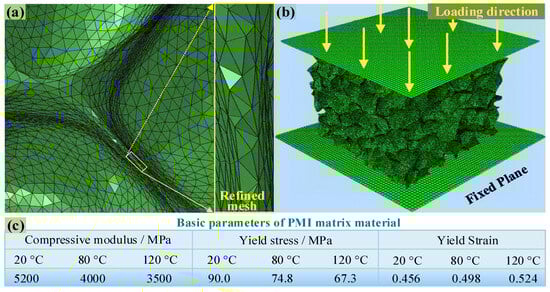 Jeon et al. [28] pointed out that when the number of foam cells contained in any direction exceeds five, the macro-mechanical properties of foam will no longer change with an increase in the number of foam cells. According to the 3D rRVE with a size of 4.482 mm × 4.482 mm × 4.482 mm shown in Figure 3d, each direction contains more than five complete cells, while the entire rRVE model contains a total of 206 PMI cells. First, extract the inner and outer surfaces of the 3D model (see Figure 3d) and transform them into surface meshes of triangular elements; then, the surface meshes were converted into ten node tetrahedral elements (C3D10M), as shown in Figure 4a. Grid refinement was applied to the thinner cell walls (see the subfigure of Figure 4a) so that the wall thickness direction contains at least two layers of grids to ensure calculation accuracy. The entire 3D rRVE has a total of 6,661,478 elements, as shown in Figure 4b. Fix the six degrees of freedom of the bottom base and retain 1 degree of freedom of the upper plate in the compression direction. Finally, a sequential thermal–mechanical coupling analysis was adopted, i.e., applying temperature boundary conditions and then applying a compression displacement of 1.5 mm to the rRVE, as illustrated in Figure 4b.
