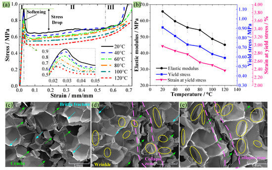 Figure 7c–e presents the SEM images of the compressive collapse zone of PMI foam at 20, 80, and 120 °C, respectively. Figure 7c shows that at 20 °C, there are many continuous cracks in the failure area, and there are almost no obvious wrinkles on the surface of the crushed PMI cell walls. In addition, the fractured cross-sections of PMI cell walls are relatively smooth, indicating that the PMI tends to brittle failure at 20 °C; that is, the PMI foam belongs to elastic–brittle rigid foams at room temperature [30]. When the temperature rises to 80 °C (Figure 7d), many cell walls are pressed into wrinkles, which indicates that the failure mode of PMI foam changes to plastic deformation/yield of the PMI matrix. When the temperature reaches 120 °C, as shown in Figure 7e, a large number of wrinkles appear on the cell walls, suggesting that the failure mode of PMI foam at 120 °C is mainly dominated by the plastic yield of PMI matrix.
