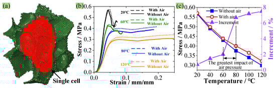 Figure 9b illustrates the influence of air on the compressive mechanical behavior of PMI foam at different temperatures. The obtained σs is much lower than the experimental value, which is attributed to the stress reduction caused by the small size of the RVE model (Figure 9a). It can be seen that the presence or absence of air within the single cell has a small effect on the compressive stress–strain curves of PMI foam within the range of 20–60 °C. However, when the temperature rises to 80 °C, the influence of air pressure on the compressive stress of PMI foam increases, and the σs with air is about 6.7% higher than that without air. Similarly, at 120 °C, the σs with air improves by 7.5% than that without air. The influences of air pressure on the σs of PMI foam, as well as the increment of σs with air compared with σs without air at different temperatures, are presented in Figure 9c. It can be seen that after 60 °C, the influence of air pressure on the σs becomes more obvious. In addition, this influence is most significant in the 60–80 °C range. This is because, in the range of 60–80 °C, the failure mode of PMI foam begins to change to plastic yield. The delayed destruction of foam cells increases the pressure inside the cells, thereby increasing the compressive capacity of PMI foam. Therefore, within the range of 60–80 °C, the decrease rate in σs and E obtained from the experiment decreases obviously (see Figure 7b). However, when the temperature exceeds 80 °C, because the plastic deformation of PMI foam increases with the temperature, the pressure in the cells cannot always increase significantly, so the influence of air does not increase with the further increased temperature.