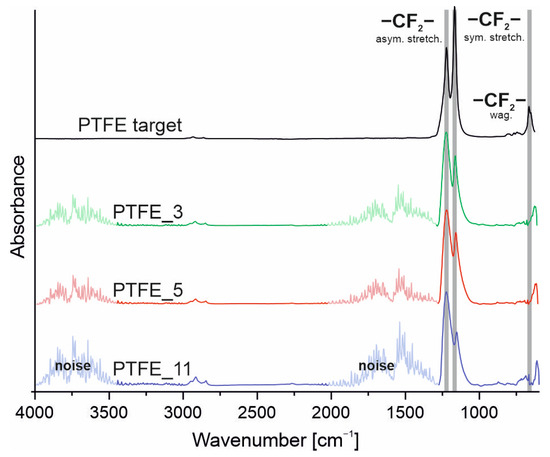 FTIR spectra of the PTFE coatings and target material.