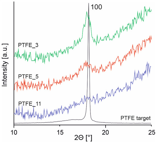For the PTFE coatings, the significantly lower number of perpendicular PTFE chains, as evidenced by the A2/E1 ratio for the coatings being almost twice as high as for the PTFE_target, indicates a different construction, i.e., they cannot be formed solely as a result of the addition of CF2 groups. A significantly higher ratio of C-C bonds (band 1230 cm−1) compared to C-F bonds in the structure of the coatings shows that the resulting chains are built with a certain fluorine deficit, leading to chain branching and crosslinking of the coating. The PTFE_3 and PTFE_5 coatings have twice the ratio of C-C bonds compared to the target, while PTFE_11 has almost three times as much. Assuming that the fraction of C-C bonds in the reference PTFE, i.e., 15%, is the initial amount X0, while the fraction of C-C bonds in the particular coating XPTFE is the amount enlarged by the number of chain branches and network nodes, the IR-estimated crosslinking degree was calculated based on the formula (XPTFE − X0)/XPTFE. On this basis, it can be inferred that the degree of crosslinking of the PTFE_3 and PTFE_5 coatings is at a similar level, while PTFE_11 exhibits the highest degree of crosslinking. Since an increase in the degree of crosslinking of the polymer material directly affects its degree of crystallinity (lowering it due to the disruption of the symmetry and linearity of the chains required for the formation of ordered crystalline regions [23]), an examination of the physical structure was carried out using the XRD method to confirm the interpretation of the chemical structure of the coatings.