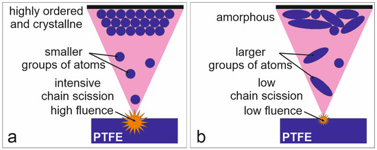 Lower gas pressure (closer to the optimal PED process conditions) results in a higher fluence of the electron beam, likely corresponding to the region where bond breaking is more intense (region marked by blue circle no. 2). High electron beam fluence leads to enhanced bond breakage at the ablation step. Consequently, the formation of shorter PTFE chains (smaller groups of atoms) transported in the plasma plume to the substrate results in fewer crosslinked structures (PTFE_3 and PTFE_5). Creation of the coating from groups consisting of one to a few carbon atoms allows a highly ordered and crystalline PTFE structure to form, as typically obtained for other PVD techniques [1,34,35], as schematically shown in Figure 7a. The high mobility and low steric hindrance of the deposited short PTFE chain fragments promote the creation of a linear PTFE chain.