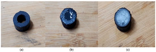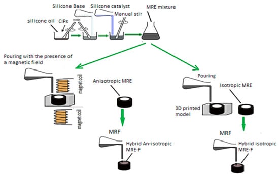 Furthermore, a robust MR effect is guaranteed through the formation of a chain-like structure in particle packing, facilitating increased magnetic dipole interaction with nearby particles. Four types of MRE samples were prepared for this study, each was cylindrical shaped with the following dimensions: a diameter of 15 mm, a thickness of 3.5 mm, and a height of 10 mm. These dimensions are taken as per DMA’s guide. Fabrication was executed for isotropic and anisotropic MRE samples, including the hybrid MREs (H-MRE). A detailed depiction of the process is provided in Figure 1, while Figure 2 illustrates the manufacture of H-MRE-F samples. Silicone oil is added with 20% of the total volume in MRE fabrication, which works as a softening agent and decreases the storage order to extract air bubbles [13]. PMX-200 Silicone Fluid 100 cSt obtained from The Dow Chemical Company, United States, was used as a silicone oil component in the experimental materials. The preparation of anisotropic MREs differs from isotropic ones, mainly in the curing process, where a 270 mT magnetic field is applied to the mold’s mixture using coils, The magnetic felid density is measured using a Gauss meter. In the case of the hybrid sample, an MRF was enclosed within the MRE and sealed using 0.8 mm steel on both sides. This formulation comprised CIPs mixed with a 30% volume fraction of silicone oil [12].