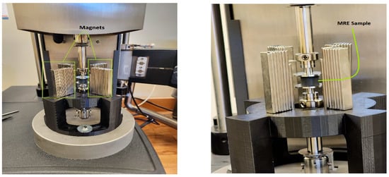 Magnetorheological (MR) materials are classified as smart materials capable of altering their rheological properties, such as viscosity and dynamic modulus, when exposed to a magnetic field. Depending on the medium used, MR materials can be categorized into two groups: magnetorheological fluids (MRFs) and magnetorheological elastomers (MREs). The fabrication process of the MRE samples involves three steps: mixing, molding, and curing [1]; in magnetorheological fluids (MRFs), magnetic particles are suspended within a carrier fluid. When subjected to an external magnetic field, the MRFs alter their structure from liquid to semi-solid. The broad flexibility of MRF becomes evident through their widespread usage in various applications, including engine mounts, brakes, and dampers [2,3], due to their quiet operation and fast reaction to the magnetic field applied [4]. However, it is important to highlight the limitations associated with MRFs, including challenges like sealing issues and particle sedimentation. As a result, future advancement in MRF-based engineering applications is quite limited.