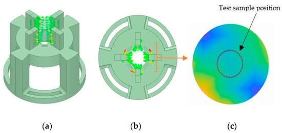 Static and dynamic compression tests were conducted using a dynamic mechanical analyzer (DMA) with the model RSA-G2 from (T.A. Instruments, New Castle, DE, USA). A specially designed holder, created through 3D printing, was crafted and attached to the DMA’s base plate. This holder secured the magnets around the MRE specimen during testing. Figure 3 illustrates the experimental setup with an additional adaptor developed to hold magnets. A finite element analysis simulation was performed to investigate the proper selection of magnetic polarity, which directs the maximum flux into the sample, as shown in Figure 4a,b [1], while Figure 4c shows the normalized flux density distribution measured using a Gauss meter F.W. Bell 5180 from (OECO LLC, Milwaukie, OR, USA), and the maximum observed value at total magnetic capacity reached approximately 160.2 mT. The cylindrical samples, with a diameter of 15 mm, height of 10 mm, and thickness of 3.5 mm, were positioned between a lower plate linked to a motor undergoing forced linear oscillations and an immobile upper plate connected to the transducer. The sample dimensions were selected to ensure compatibility with the DMA compression fixture.
