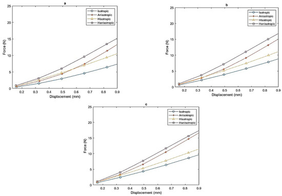 In addition, a noteworthy distinction emerges when comparing the isotropic, anisotropic, hybrid isotropic, and hybrid anisotropic samples. The graph vividly shows cases of a substantial difference in force required to achieve equivalent displacement between the four. The anisotropic samples exhibit a significantly higher force compared to their isotropic and hybrid isotropic. For instance, to achieve a 0.8 mm displacement, 15.65 N is required for the hybrid anisotropic sample. In contrast, for anisotropic, hybrid isotropic, and isotropic samples, 14.69 N, 10.27 N, and 8.61 N were respectively required to reach the same displacement (as shown in Figure 6c).
